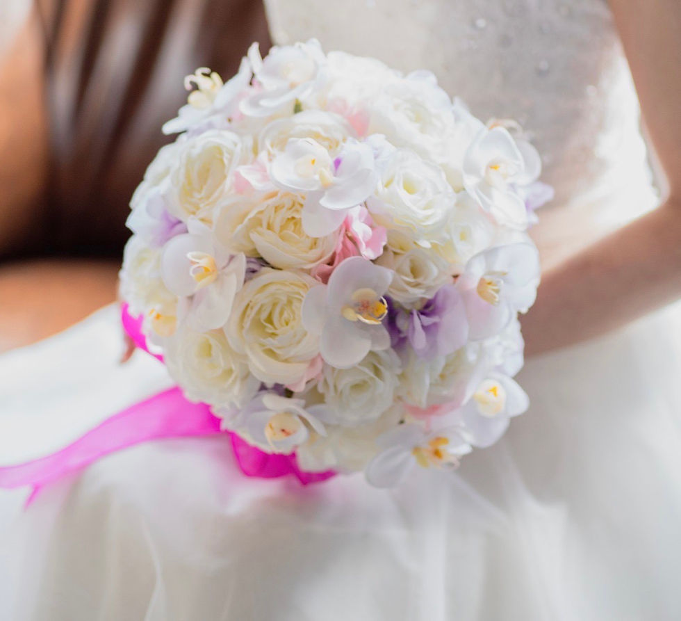 ホテルウエディングの花嫁様に、エレガントで華やかなブーケをお仕立ていたします。